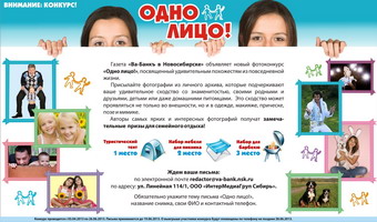 С 3 апреля на страницах газеты «Ва-Банкъ в Новосибирске» стартовал необычный фотоконкурс «Одно лицо!», посвященный удивительным похожестям из повседневной жизни. На протяжении трех месяцев редакция еженедельника будет принимать фотографии из личного архива читателей, которые подчеркивают их сходство со знаменитостями, родными, друзьями и даже домашними питомцами. Победители получат замечательные призы для семейного отдыха.